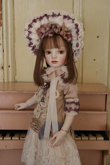 私の人形の中で一番人間の少女に近いリアルなお顔になったと思います。 この人形は、お顔に合わせて衣装を仕上げたかったので、 黒のシンプルなジャンパースカートのみをドレス作家さんにお願いしました。 沢山のアンティークやヴィンテージのアクセサリーや布花の中で 一番似合ったのは赤。 そこで、沢山のアンティークレースの中から繊細なレースを選び ケープやドロワーズにして華やかになるように仕上げました。 |