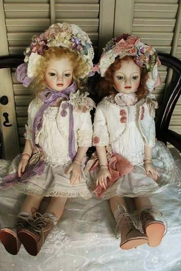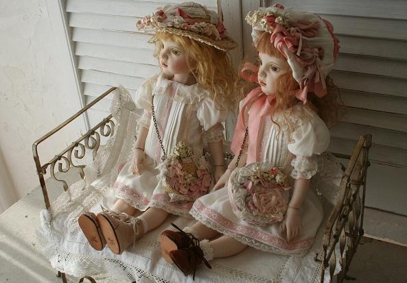 双子展出品作品ですが、 毎度のことながら双子になりませんでした。 ポイントカラーを変えたのですが、 ピンクとラベンダーでは無理がありました。 似合う目や髪の色が違うので 仕上げていくうちにどんどん 双子らしくなくなってしまったのです。 実は同じ色のドレスもあったのですが、 ドレス作家さんが染めて下さった 布花やリボンがどちらもとても素敵な色だったので 両方ご覧頂きたかったのです。 |