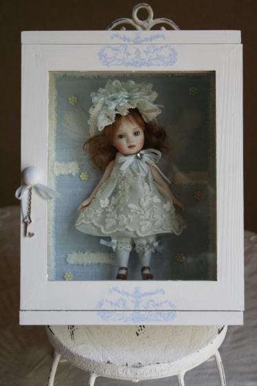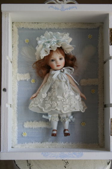 アンティークのミニョネットを見ているうちに 小さい人形が欲しくなって創った人形です。 小さい人形は大きい人形との対比でより小ささが際立つ感じにするのが好きです。 その為には大きい人形に持たせるのが効果的ですが、 小さい人形ならではの飾り方も楽しみたいと思っています。 今回は空色のシルクの布に雲に見立てたブレードとアンティークの小花を貼り 羽も付けてエンジェルにしてみました。 小さな小さなアンティークの鍵もこの人形のサイズにピッタリです。 |