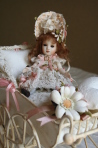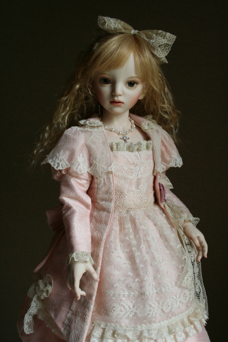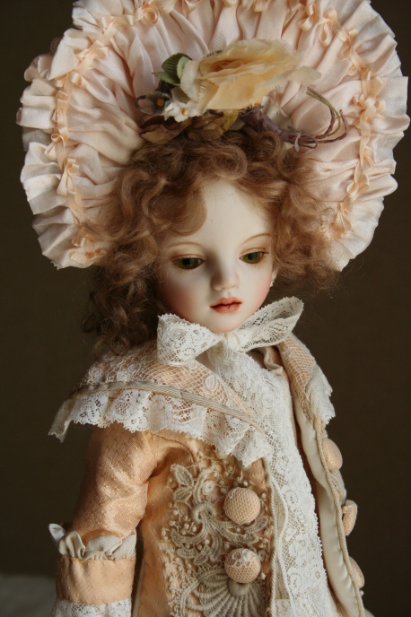 幼い女の子の人形ですが 少し色っぽく仕上がった気がします。 ピーチピンクのドレスはアンティークレースと 布花でとても華やかです。 |