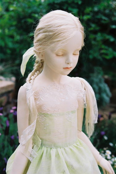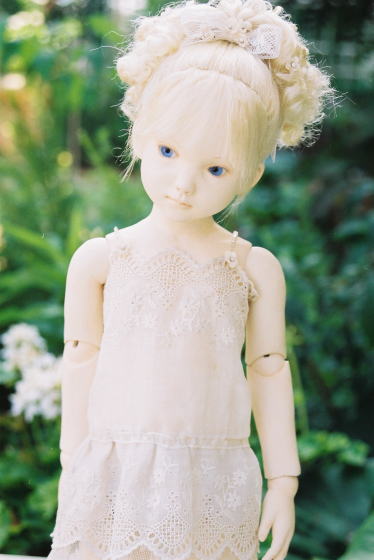仕組が分かりやっとスムーズに作業ができました。 そこでより自分の好きな顔やプロポーションを 集中して作ることができました。 この人形のフワッと優しい表情が好きで 完成から数年後ヘッドのみビスクにしました。 ドレスは、中に着ているのがアンティークの チュールレースで作ったワンピースで、羽織っているのが アンティークのペチコートで作ったガウンです。 |